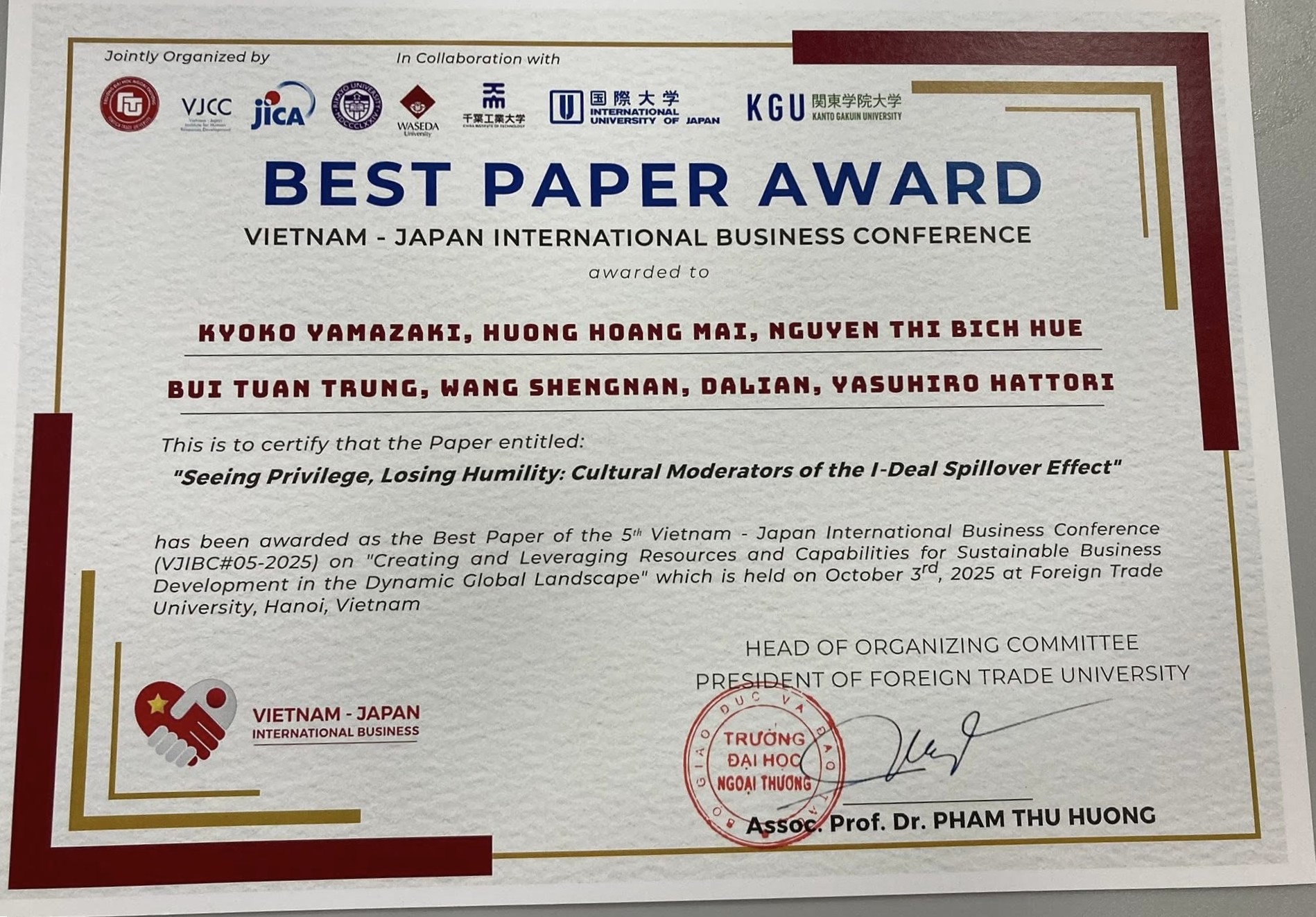 服部泰宏教授が、10月3日にベトナムのハノイで開催された、The 5th Vietnam-Japan International Business Conference にて、Best Paper Award を受賞されました。
