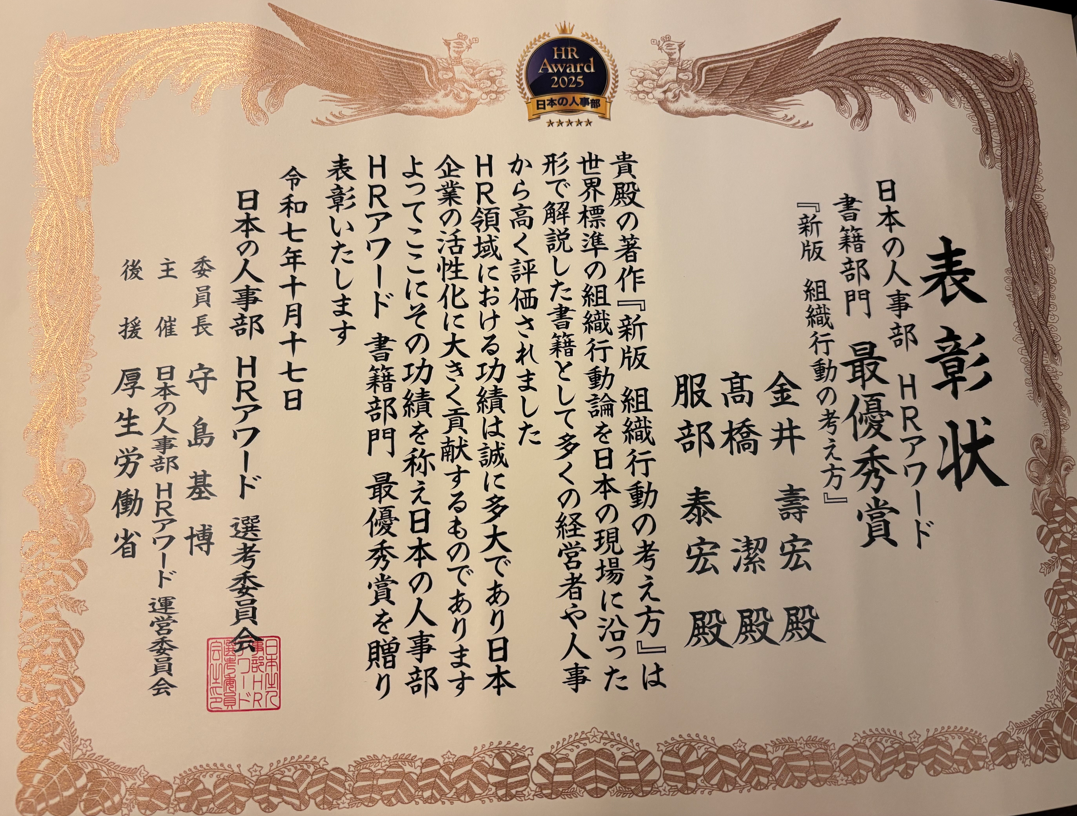 金井壽宏名誉教授、高橋潔名誉教授、服部泰宏教授の著書『新版 組織行動の考え方』が日本の人事部HRアワード書籍部門 最優秀賞を受賞しました。