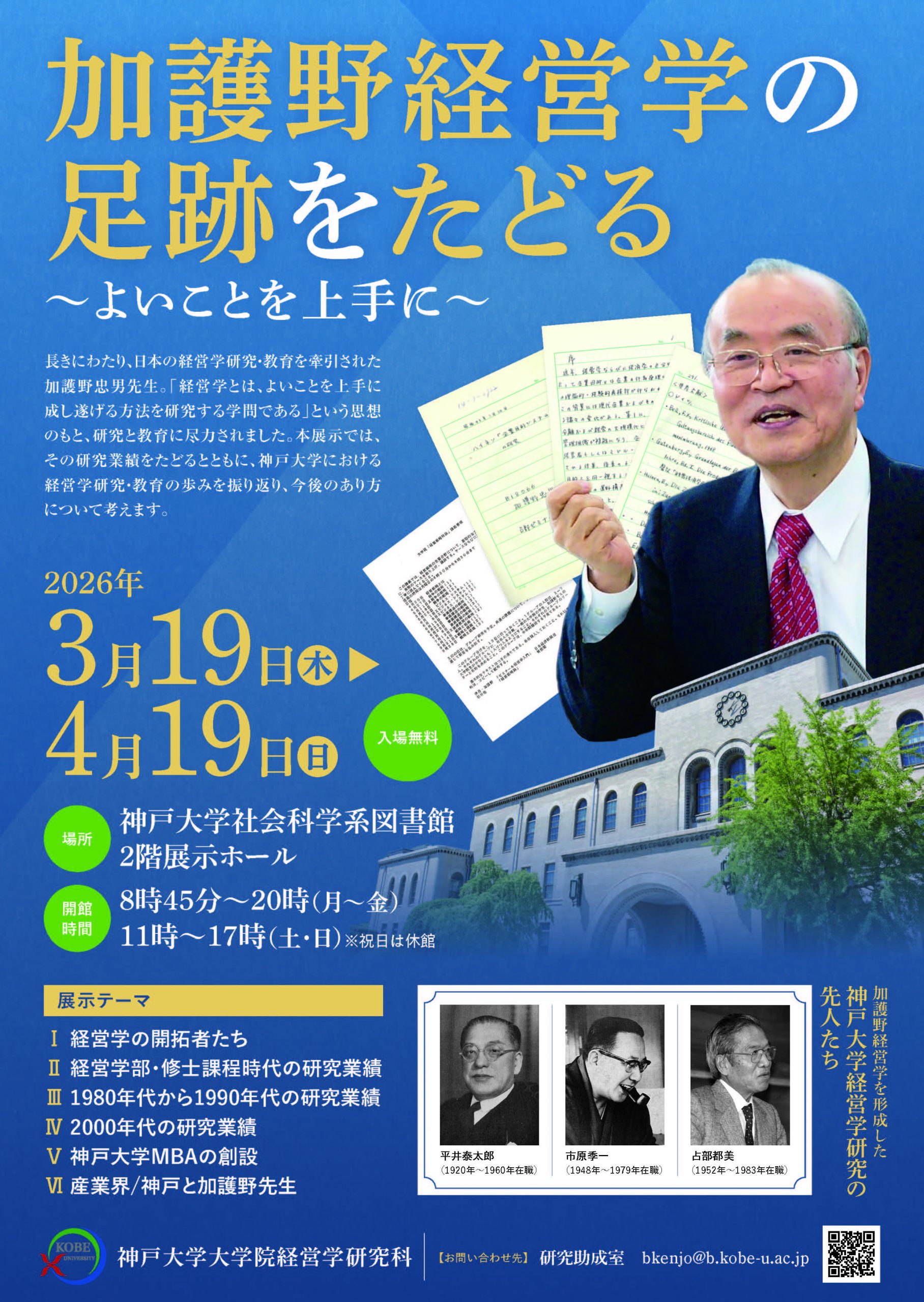2024年12月28日に逝去された元神戸大学名誉教授 加護野忠男先生の研究業績を振り返る企画展示を、神戸大学社会科学系図書館展示ホールにて開催します。