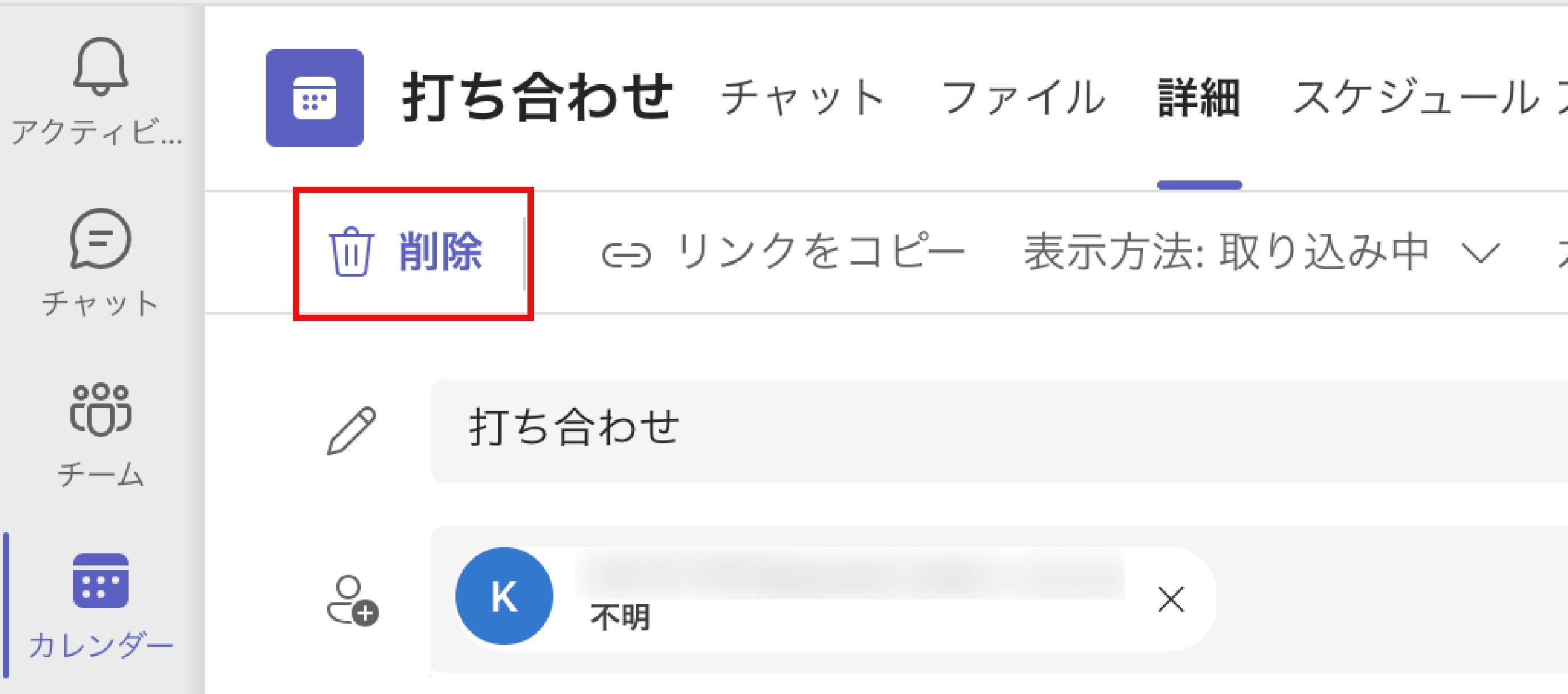 編集画面左上の「削除(会議の取り消し)」をクリックします。確認画面が表示されます。