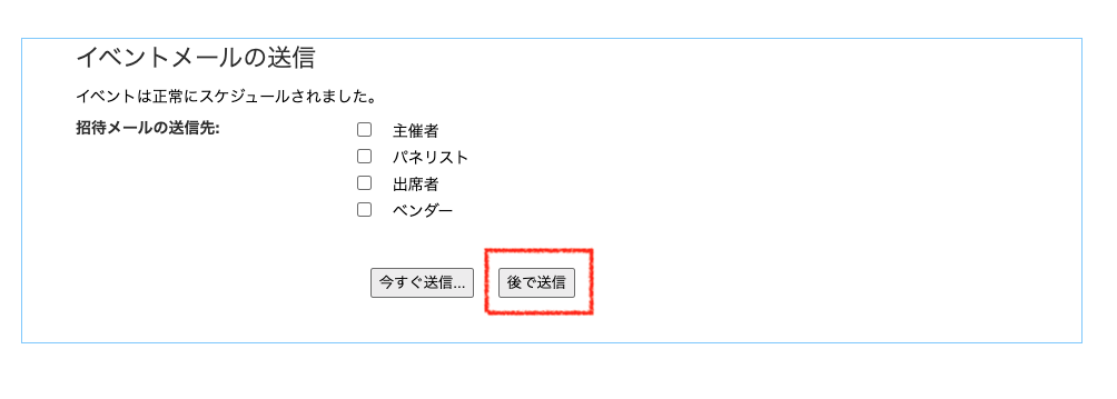 「イベントは正常にスケジュールされました」と書かれた以下の画面が出ます。参加者にメールを送る場合、送信のタイミングを選びます。すぐに送信しても問題ありませんが、慣れるまでは設定情報を再チェックしたのちに送信することをお勧めします。”後で”をクリックします。