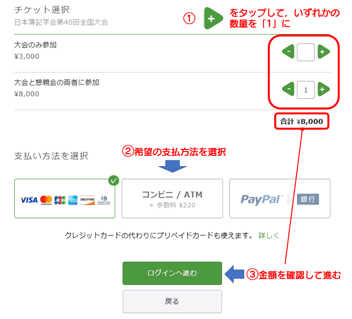 選択した参加区分および金額,支払方法が正しいことを確認し,「ログインへ進む」ボタンを選択します(下図の③)。