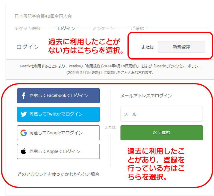 Peatixに登録済みの方はログインを,未登録の方は新規登録を行います(下図)。