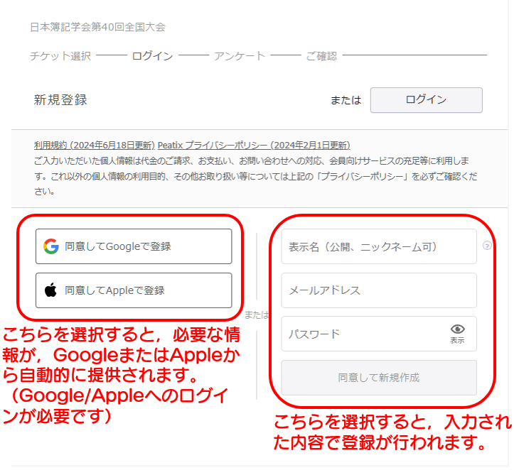 参加登録には,Peatixアカウントの作成が必要です。メールアドレスを用いた登録の他に,外部アカウント(GoogleまたはAppleのいずれか)を利用されている場合,当該外部アカウントの情報を利用して登録することが可能です。